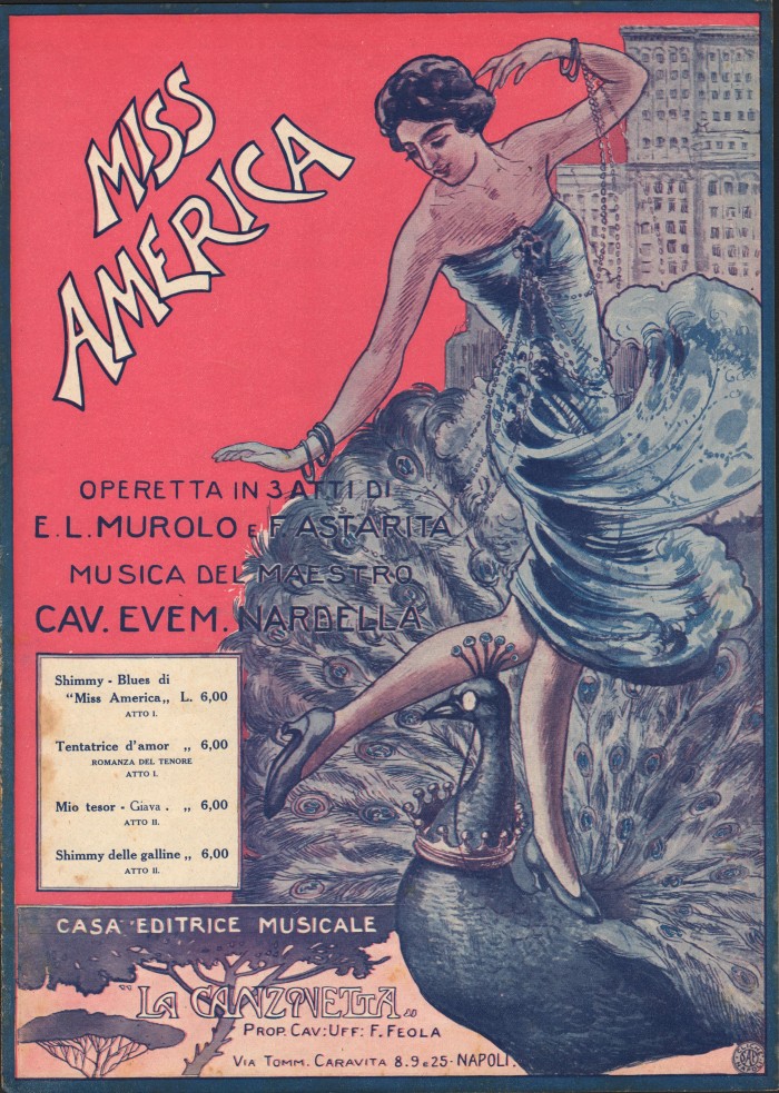 Tentatrice d'amor - Romanza del tenore, dall'operetta Miss America (1926), tre atti di Enzo Lucio Murolo e Federico Astarita - Musica di Evemero Nardella. Tentatrice d'amor (atto II) (Murolo-Astarita-Nardella). Spartito musicale di Canto & Piano edito dalla casa editrice "La Canzonetta" nel 1926.