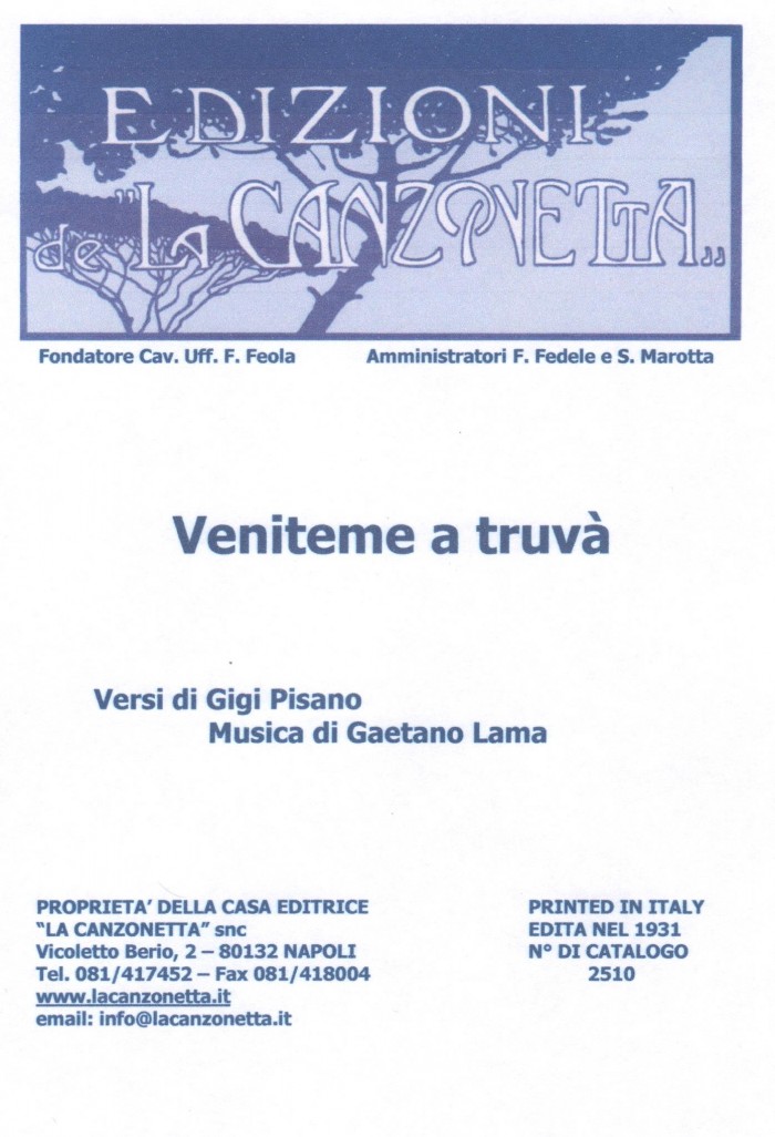 Veniteme a truva' (Versi di Gigi Pisano - Musica di Gaetano Lama). Spartito musicale di Canto & Piano edito dalla casa editrice "La Canzonetta" nel 1931.