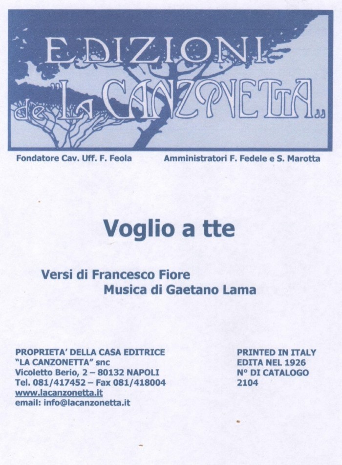Voglio a tte (Versi di Francesco Fiore - Musica di Gaetano Lama). Spartito musicale di Canto & Piano edito dalla casa editrice "La Canzonetta" nel 1926.