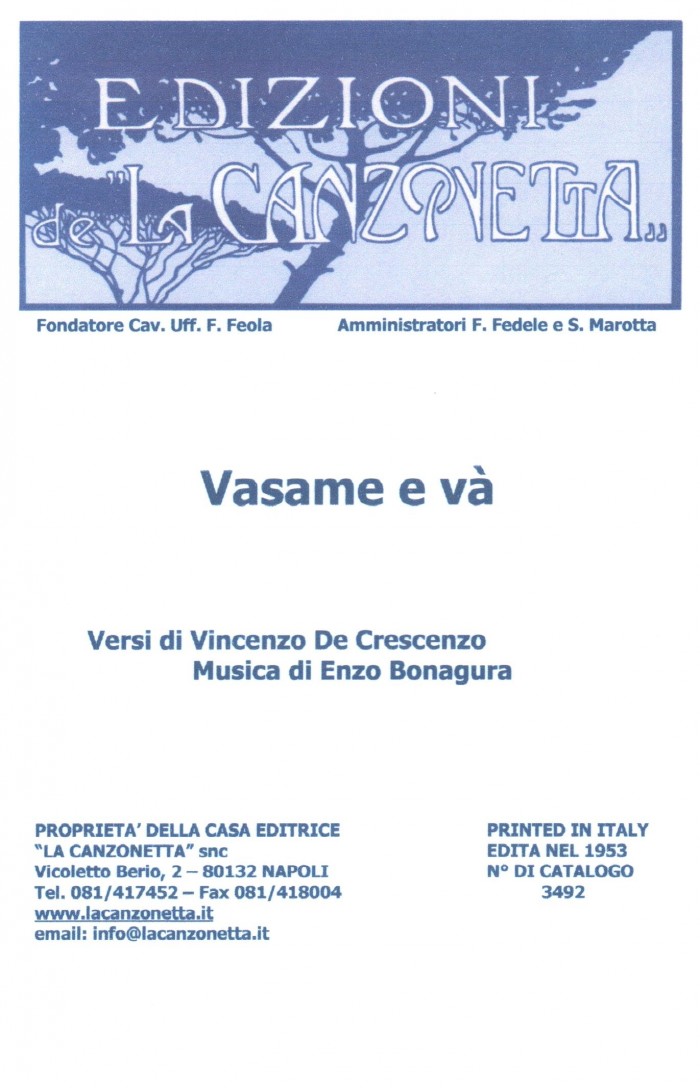 Vasame e và (Versi di Vincenzo De Crescenzo - Musica di Enzo Bonagura). Spartito musicale di Canto & Piano edito dalla casa editrice "La Canzonetta" nel 1953.