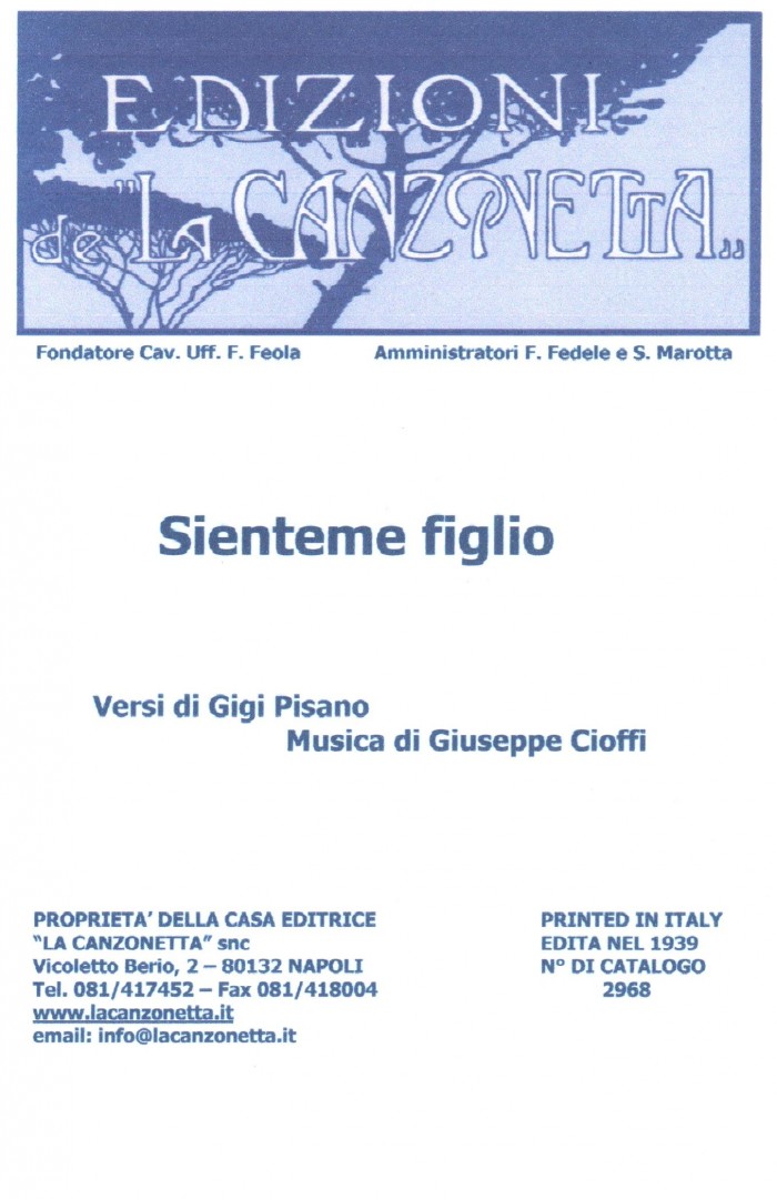 Sienteme figlio (Versi di Gigi Pisano - Musica di Giuseppe Cioffi). Spartito musicale di Canto & Piano edito dalla casa editrice "La Canzonetta" nel 1939.