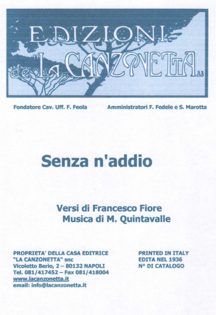 Senza n'addio (Versi di Francesco Fiore - Musica di Manfredo Quintavalle). Spartito musicale di Canto & Piano edito dalla casa editrice "La Canzonetta" nel 1936.