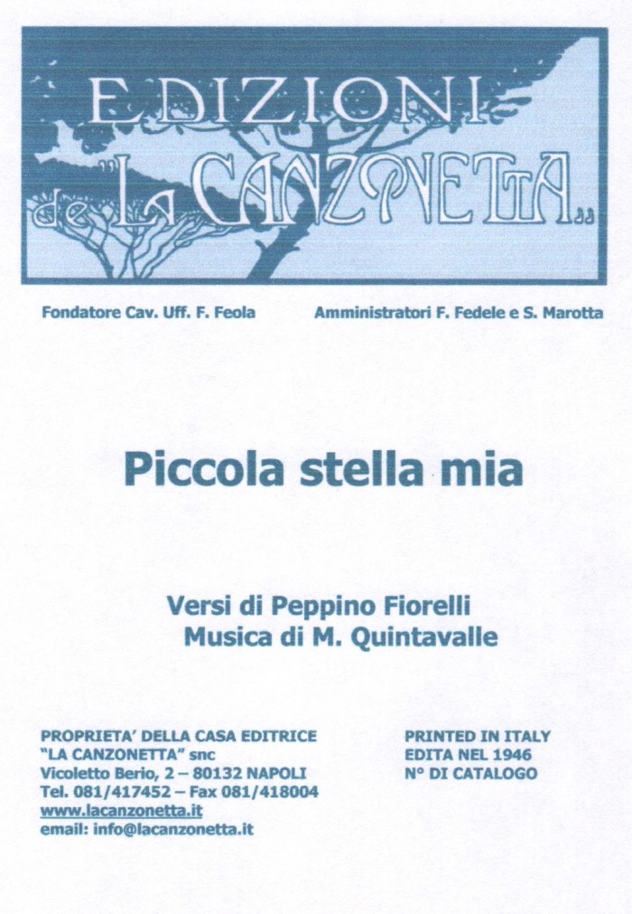 Piccola stella mia (Versi diPeppino Fiorelli - Musica di Manfredo Quintavalle). Spartito musicale di Canto & Piano edito dalla casa editrice "La Canzonetta" nel 1946.
