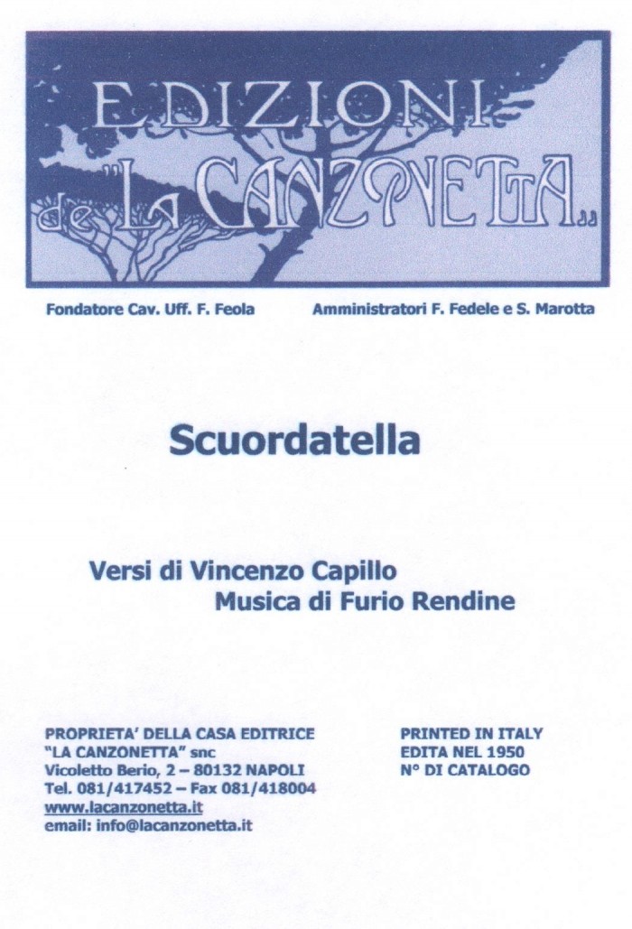 Scuordatella (Versi di Vincenzo Capillo - Musica di Furio Rendine). Spartito musicale di Canto & Piano edito dalla casa editrice "La Canzonetta" nel 1950.
