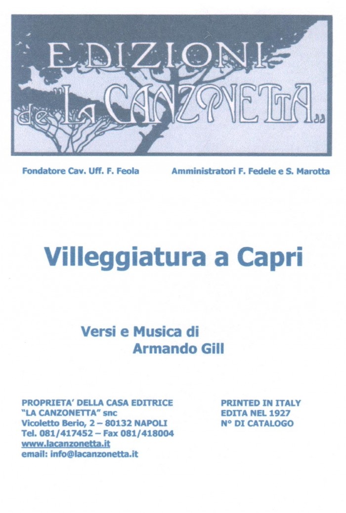 Villeggiatura a Capri (Versi e musica di Armando Gill). Spartito musicale di Canto & Piano edito dalla casa editrice "La Canzonetta" nel 1927.