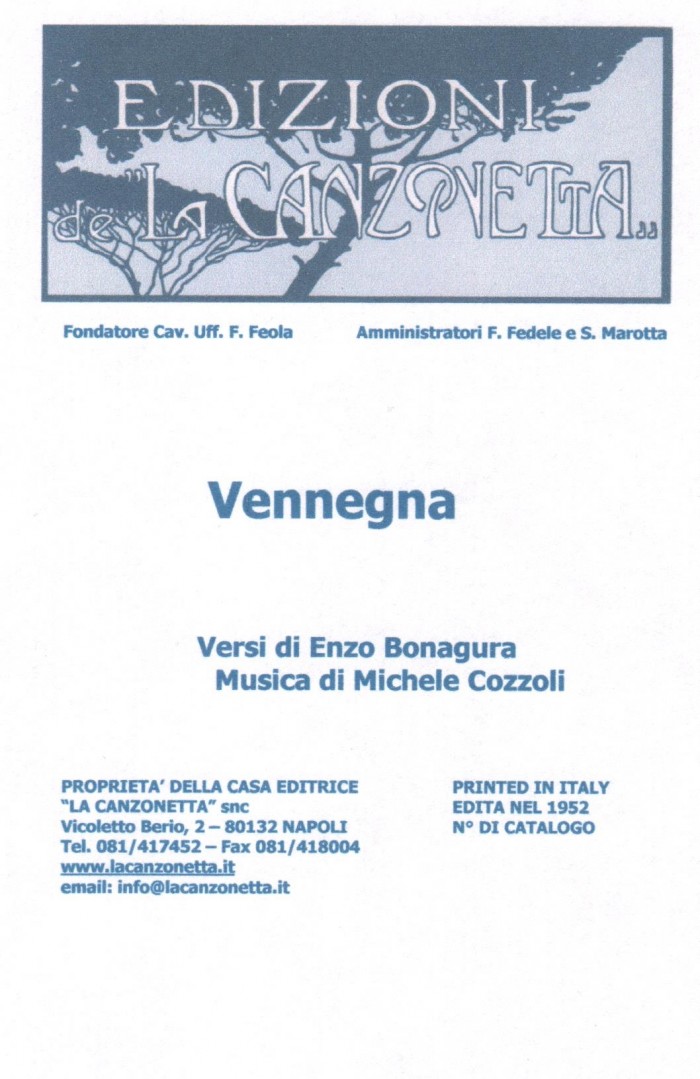 Vennegna (Versi di Enzo Bonagura - Musica di Michele Cozzi). Spartito musicale di Canto & Piano edito dalla casa editrice "La Canzonetta" nel 1952.