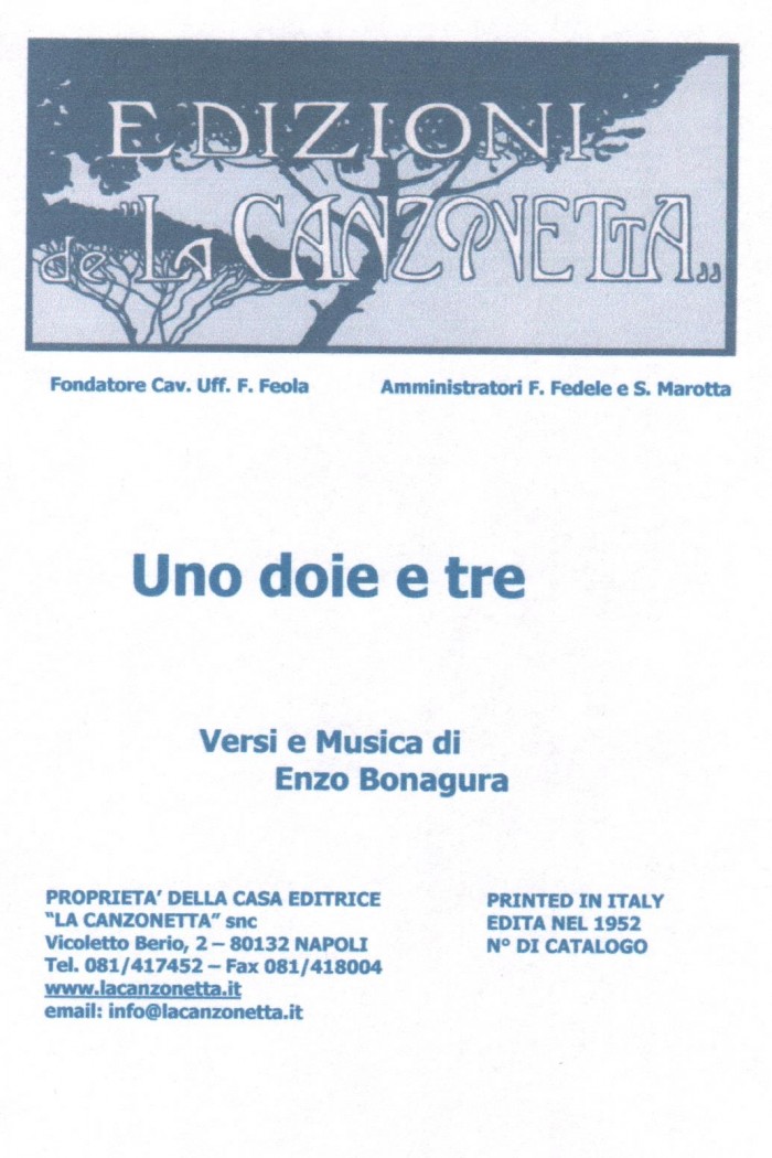 Uno ddoie e tre (Versi e Musica di Enzo Bonagura). Spartito musicale di Canto & Piano edito dalla casa editrice "La Canzonetta" nel 1952.