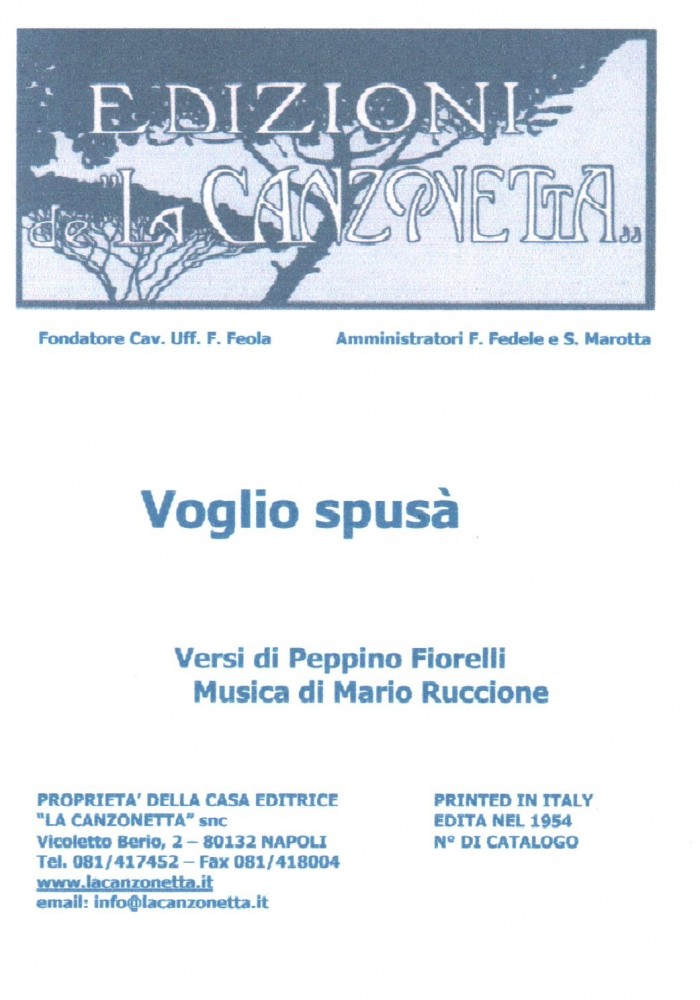 Voglio spusà (Versi di Peppino Fiorelli - Musica di Mario Ruccione). Spartito musicale di Canto & Piano edito dalla casa editrice "La Canzonetta" nel 1954.