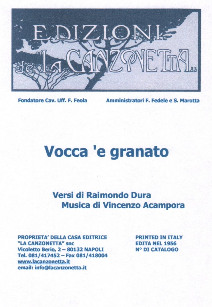 Vocca 'e granato (Versi di Raimondo Dura - Musica di Vincenzo Acampora). Spartito musicale di Canto & Piano edito dalla casa editrice "La Canzonetta" nel 1956.