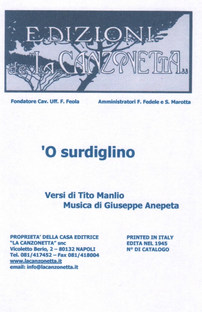 'O surdiglino (Versi di Tito Manlio - Musica di Giuseppe Anepeta). Spartito musicale di Canto & Piano edito dalla casa editrice "La Canzonetta" nel 1945.