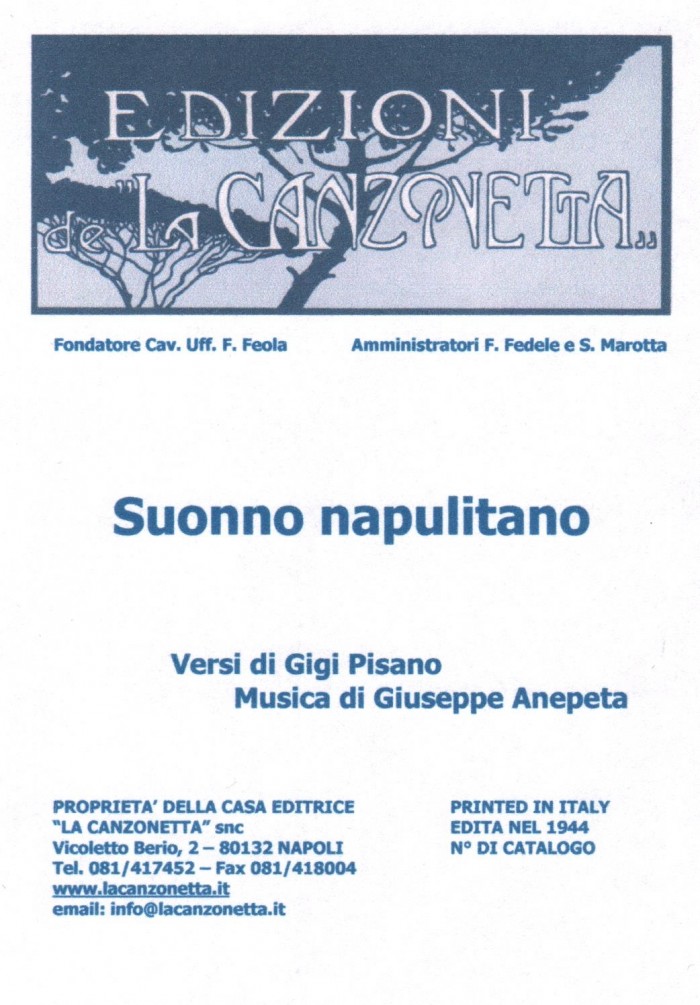 Suonno napulitano (Versi di Gigi Pisano - Musica di Giuseppe Anepeta). Spartito musicale di Canto & Piano edito dalla casa editrice "La Canzonetta" nel 1944.