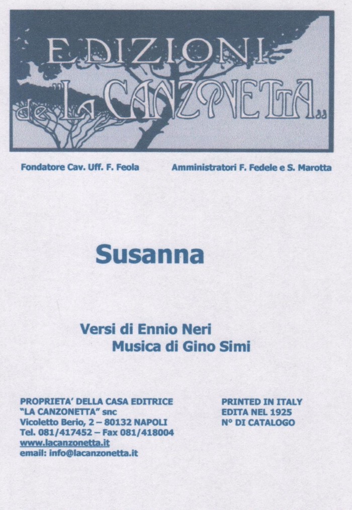 Susanna (Versi di Ennio Neri - Musica di Gino Simi). Spartito musicale di Canto & Piano edito dalla casa editrice "La Canzonetta" nel 1925.