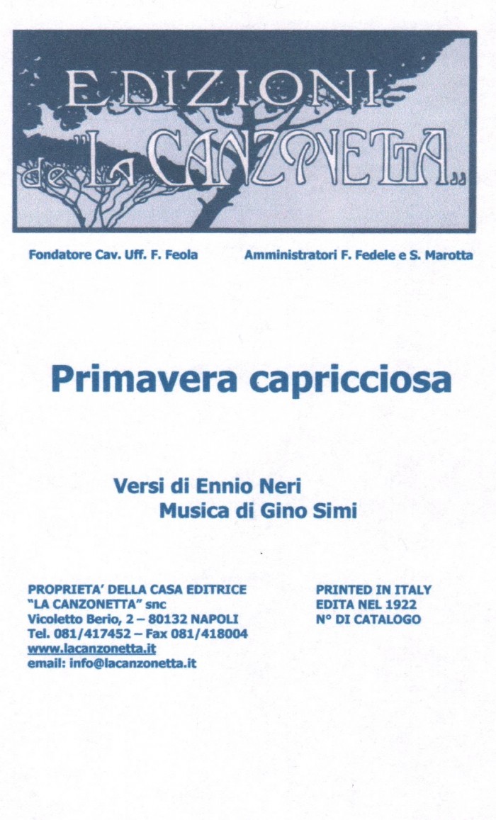 Primavera capricciosa (Versi di Ennio Neri - Musica di Gino Simi). Spartito musicale di Canto & Piano edito dalla casa editrice "La Canzonetta" nel 1922.