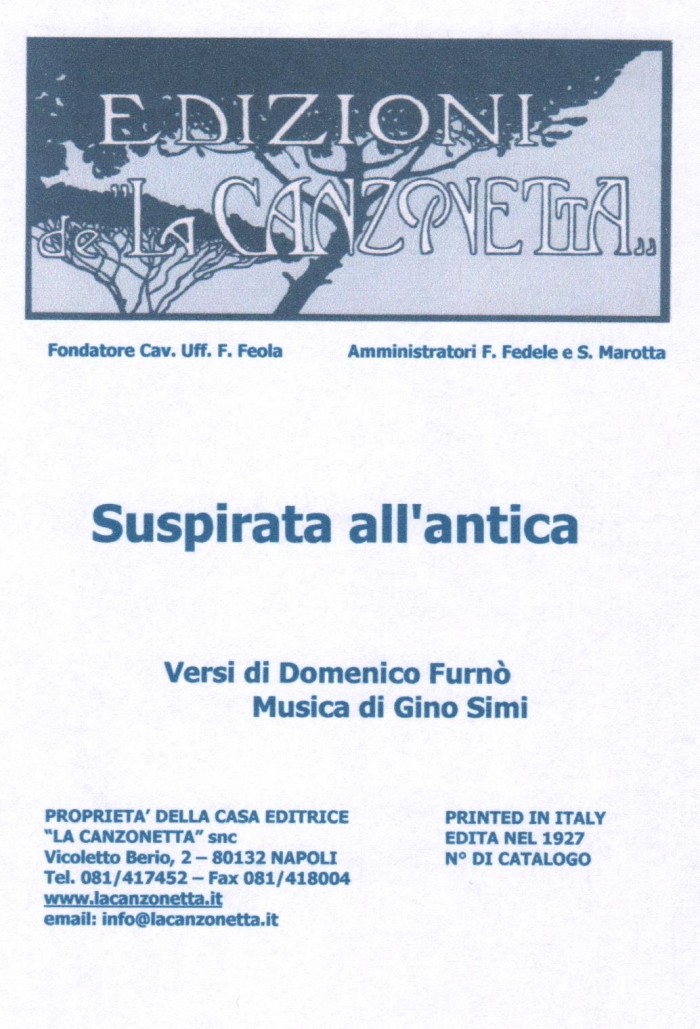 Suspirata all'antica (Versi di Domenico Furnà - Musica di Gino Simi). Spartito musicale di Canto & Piano edito dalla casa editrice "La Canzonetta" nel 1927.