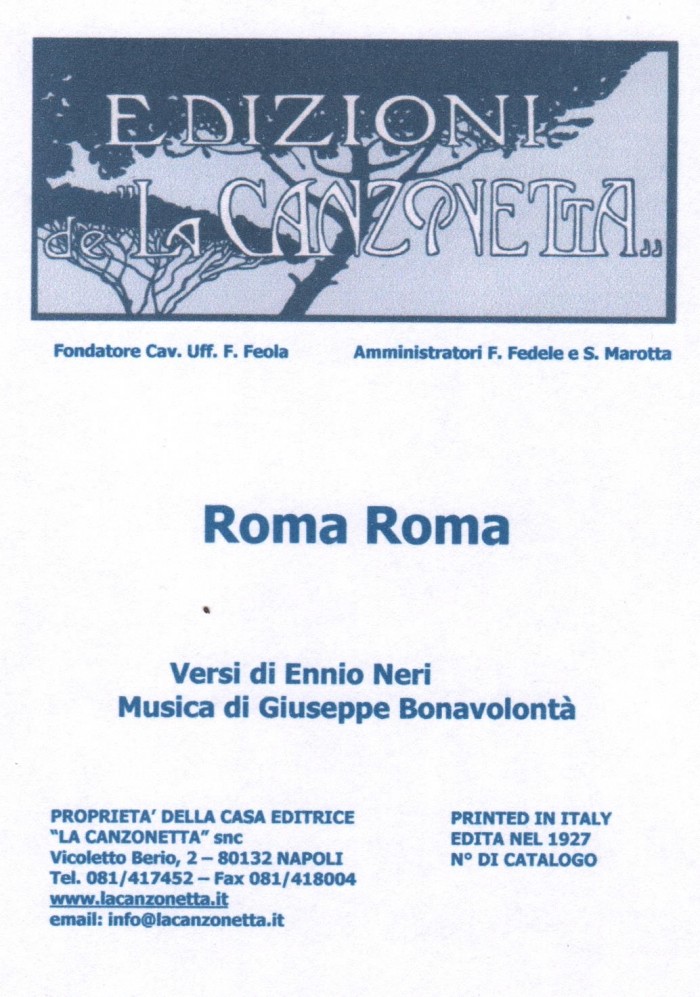 Roma Roma (Versi di Ennio Neri - Musica di Giuseppe Bonavolontà). Spartito musicale di Canto & Piano edito dalla casa editrice "La Canzonetta" nel 1927.