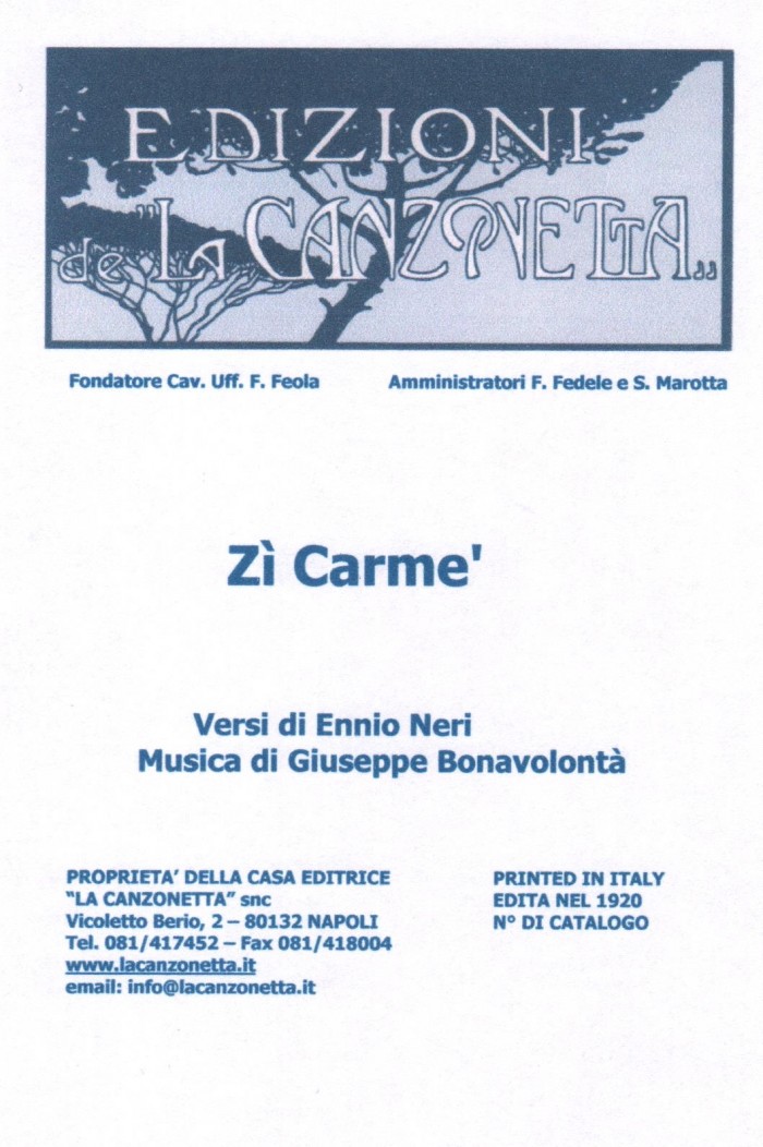 Zì Carmè (Versi di Ennio Neri - Musica di Giuseppe Bonavolontà). Spartito musicale di Canto & Piano edito dalla casa editrice "La Canzonetta" nel 1920.