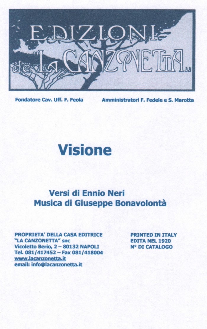 Visione (Versi di Ennio Neri - Musica di Giuseppe Bonavolontà). Spartito musicale di Canto & Piano edito dalla casa editrice "La Canzonetta" nel 1920.