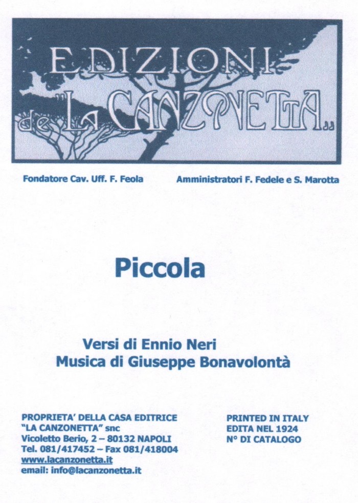 Piccola (Versi di Ennio Neri - Musica di Giuseppe Bonavolontà). Spartito musicale di Canto & Piano edito dalla casa editrice "La Canzonetta" nel 1924.