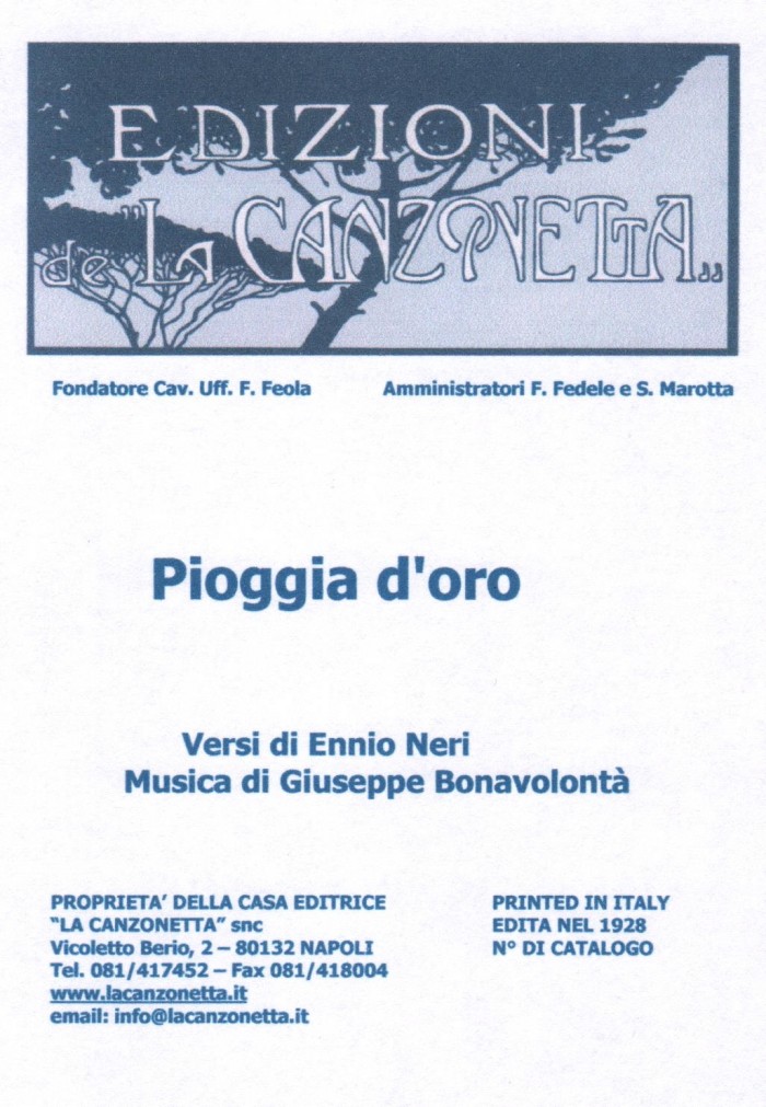 Pioggia d'oro (Versi di Ennio Neri - Musica di Giuseppe Bonavolontà). Spartito musicale di Canto & Piano edito dalla casa editrice "La Canzonetta" nel 1928.