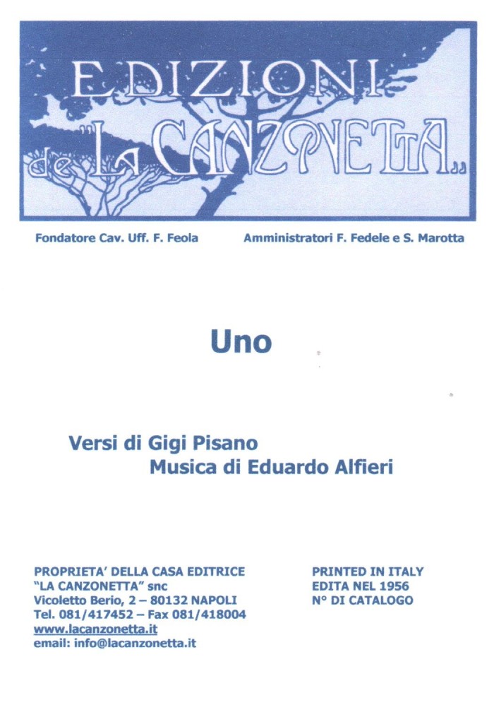 Uno (Versi di Gigi Pisano - Musica di Eduardo Alfieri). Spartito musicale di Canto & Piano edito dalla casa editrice "La Canzonetta" nel 1956.