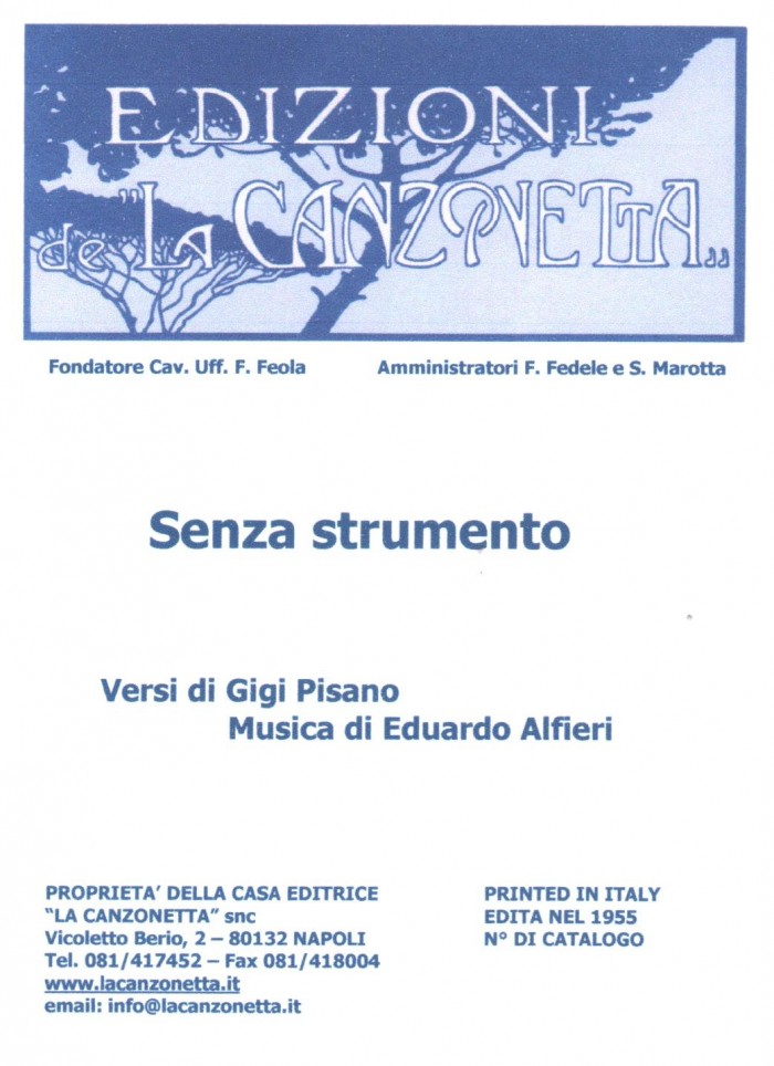 Senza strumento (Versi di Gigi Pisano - Musica di Eduardo Alfieri). Spartito musicale di Canto & Piano edito dalla casa editrice "La Canzonetta" nel 1955.
