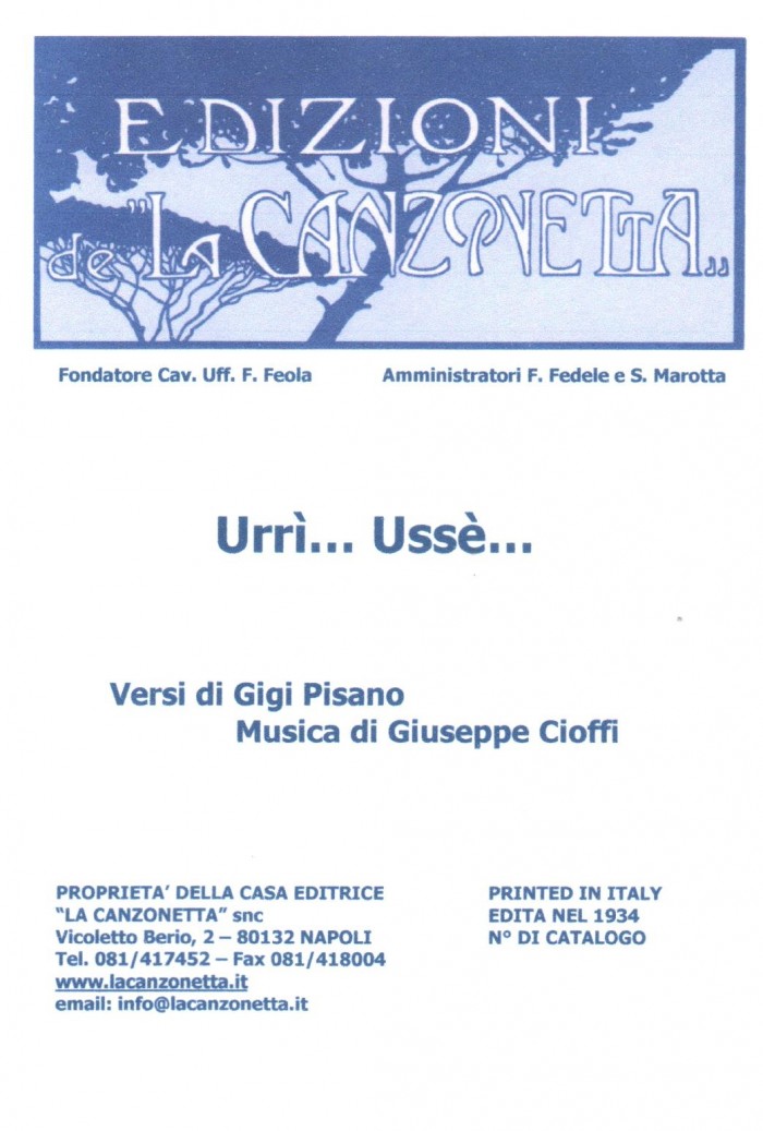 Urrì Ussè (Versi di Gigi Pisano - Musica di Giuseppe Cioffi). Spartito musicale di Canto & Piano edito dalla casa editrice "La Canzonetta" nel 1934.