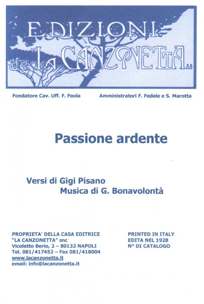 Passione ardente (Versi di Gigi Pisano - Musica di Giuseppe Bonavolontà). Spartito musicale di Canto & Piano edito dalla casa editrice "La Canzonetta" nel 1928.