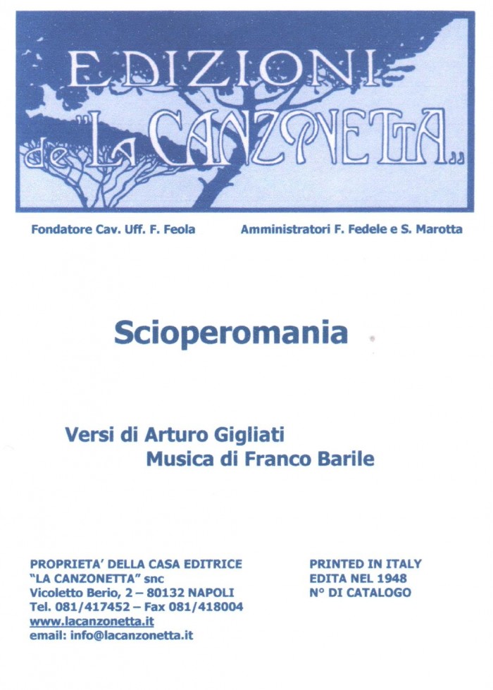 Scioperomania (Versi di Arturo Gigliati - Musica di Franco Barile). Spartito musicale di Canto & Piano edito dalla casa editrice "La Canzonetta" nel 1948.