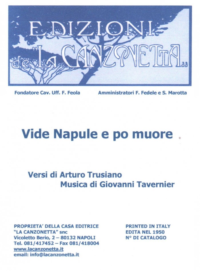 Vide Napule e po muore (Versi di Arturo Trusiano - Musica di Giovanni Tavernier). Spartito musicale di Canto & Piano edito dalla casa editrice "La Canzonetta" nel 1950.