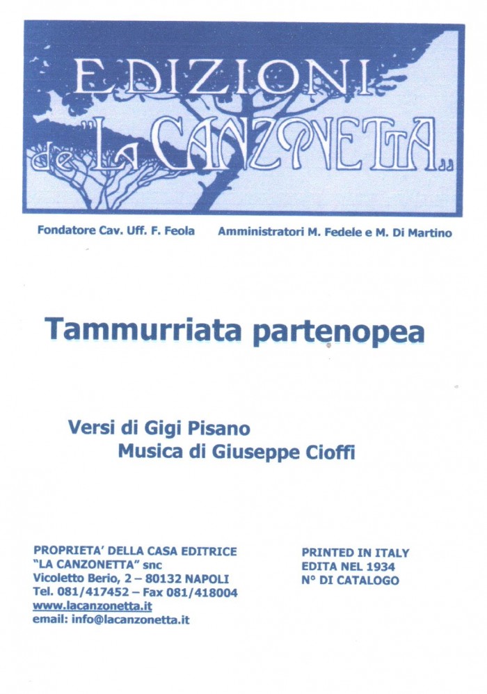 Tammurriata partenopea (Versi di Gigi Pisano - Musica di Giuseppe Cioffi). Spartito musicale di Canto & Piano edito dalla casa editrice "La Canzonetta" nel 1934.