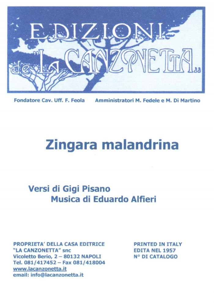 Zingara malandrina (Versi di Gigi Pisano - Musica di Eduardo Alfieri). Spartito musicale di Canto & Piano edito dalla casa editrice "La Canzonetta" nel 1957.