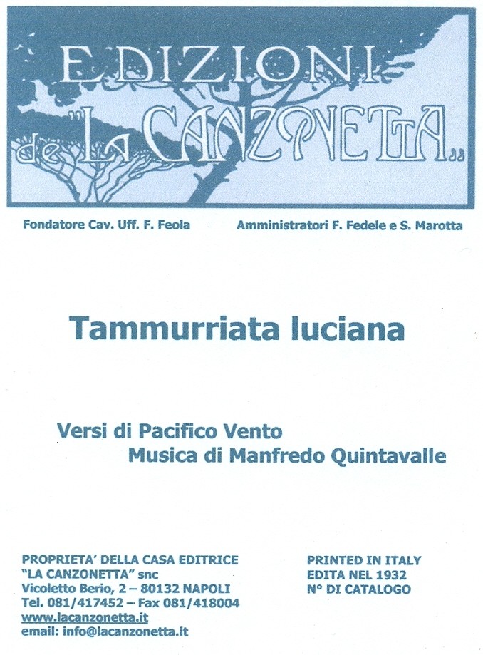 Tammurriata luciana (Versi di Pacifico Vento - Musica di Manfredo Quintavalle). Spartito musicale di Canto & Piano edito dalla casa editrice "La Canzonetta" nel 1932.