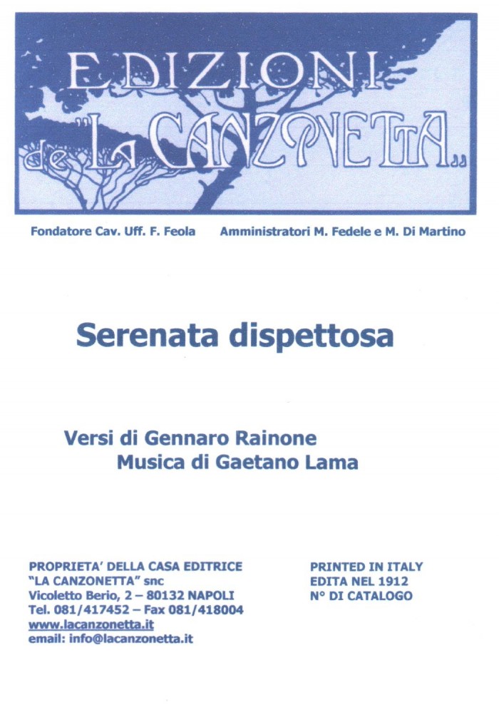 Serenata dispettosa (Versi di Gennaro Rainone - Musica di Gaetano Lama). Spartito musicale di Canto & Piano edito dalla casa editrice "La Canzonetta" nel 1912.