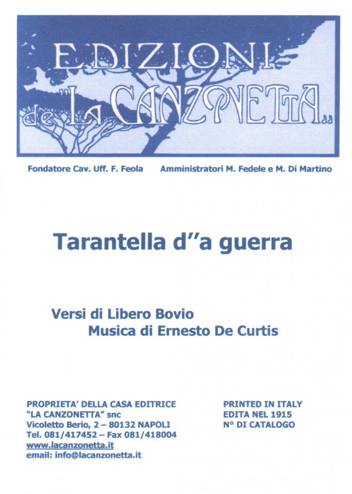 Tarantella d''a guerra (Versi di Libero Bovio - Musica di Ernesto De Curtis). Spartito musicale di Canto & Piano edito dalla casa editrice "La Canzonetta" nel 1915.