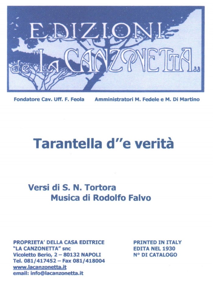 Tarantella d''e verita' (Versi di S. N. Tortora - Musica di Rodolfo Falvo). Spartito musicale di Canto & Piano edito dalla casa editrice "La Canzonetta" nel 1930.