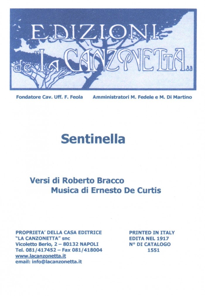 Sentinella (Versi di Roberto Bracco - Musica di Ernesto De Curtis). Spartito musicale di Canto & Piano edito dalla casa editrice "La Canzonetta" nel 1917.