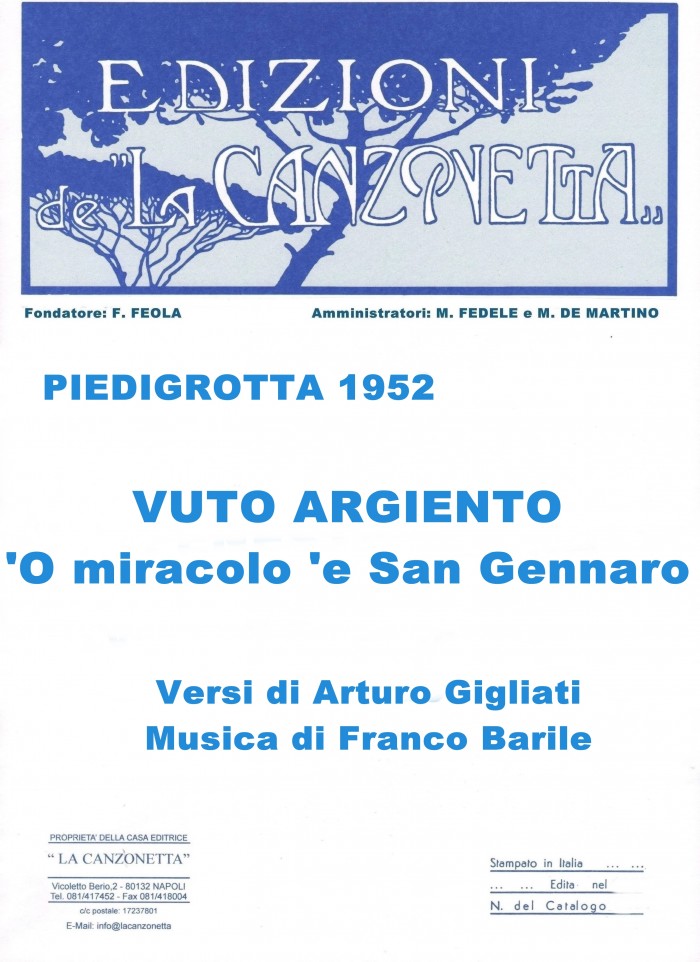 Vuto argiento (Il miracolo di San Gennaro) (Versi di Arturo Gigliati - Musica di Franco Barile). Spartito musicale di Canto & Piano edito dalla casa editrice "La Canzonetta" nel 1952.