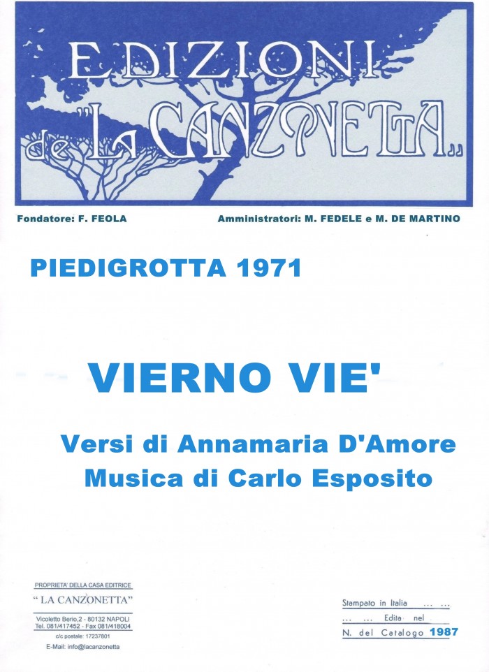 Vierno vie' (Versi di Annamaria D'Amore - Musica di Carlo Esposito). Spartito musicale di Canto & Piano edito dalla casa editrice "La Canzonetta" nel 1971.