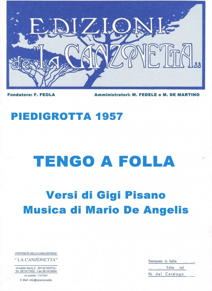 Tengo a folla (Versi di Gigi Pisano - Musica di Mario De Angelis). Spartito musicale di Canto & Piano edito dalla casa editrice "La Canzonetta" nel 1957.