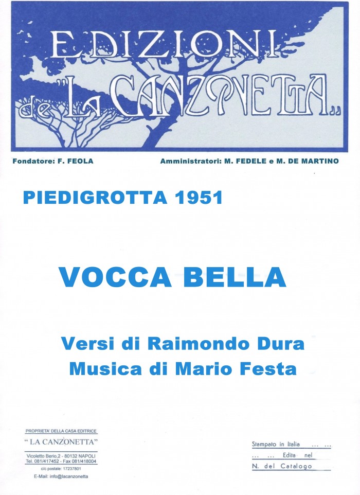 Vocca bella (Versi di Raimondo Dura - Musica di Mario Festa). Spartito musicale di Canto & Piano edito dalla casa editrice "La Canzonetta" nel 1951.