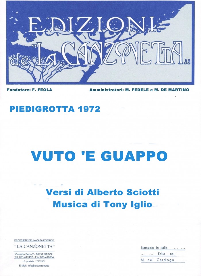 Vuto 'e guappo (Versi di Alberto Sciotti - Musica di Tony Iglio). Spartito musicale di Canto & Piano edito dalla casa editrice "La Canzonetta" nel 1972.